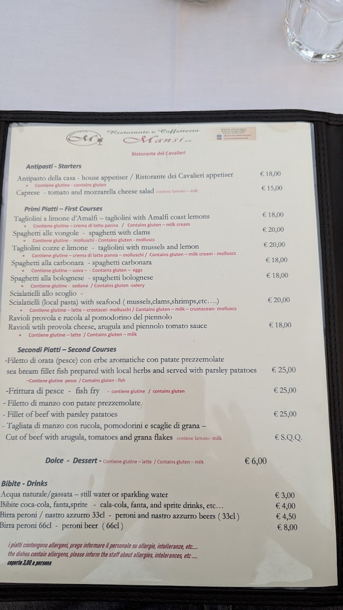The menu at Ristorante Dei Cavalieri reflects a thoughtfully simple yet refined Italian dining experience. It’s the kind of place where you can enjoy fresh, well-prepared dishes that highlight local ingredients and traditional flavors without any fuss. From comforting pasta plates to light, fresh starters and satisfying desserts, the offerings invite you to savor each bite in a relaxed setting.